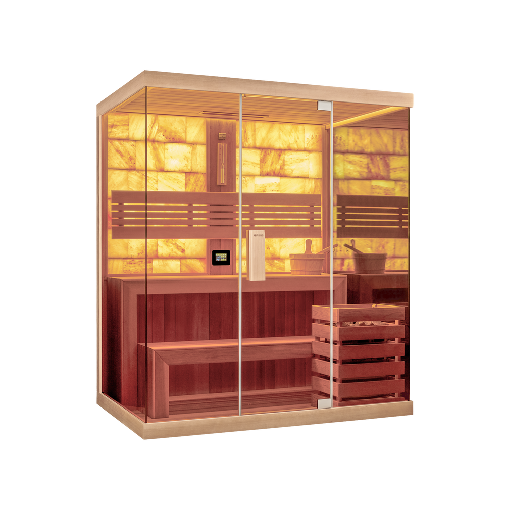 Crafted from natural cedar and framed with three-sided optically clear glass, it offers an open and inviting atmosphere. Concealed LED chromotherapy lights softly illuminate the salt wall, creating a tranquil, radiant glow.